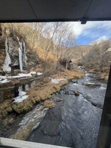 部屋に戻る途中、渡り廊下を歩いていると目に飛び込んできたのは氷瀑。それほどの冷え込みだったということです。幻想的な光景に思わず立ち止まりました。部屋に戻ると母も起きていて、ともに朝食会場へ向かいました。