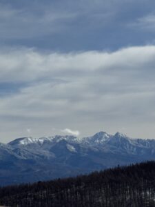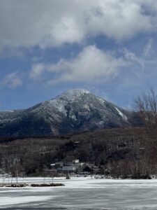 白樺湖に立ち寄ると、冬の白樺湖は凍りつき、秋に来たときの夕暮れの景色とはまったく違う趣がありました。湖の背後には蓼科山がすっかり雪化粧している姿が見えます。雲の流れは速く、「今日の北横岳は私たちには厳しかっただろうな」と思いながら、ビーナスラインへ。