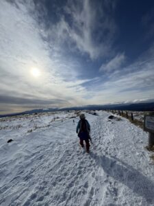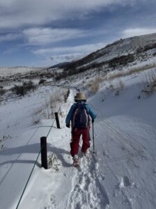 1ポールを手に、一歩ずつ確実に進む母の足取りは軽やか。積雪期の霧ヶ峰は、雪に覆われた湿原地帯を歩く独特の感覚があります。危険箇所は特になく、76歳の母にとっても難所と感じる場所はありませんでした。