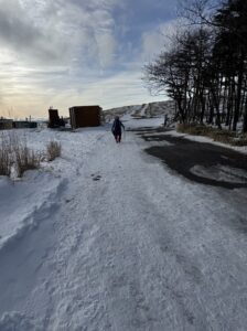 スキー場に入ると少し傾斜がありますが、問題ない程度です。スキーヤーと交差する場所では端を歩くよう気をつけながら進みます。