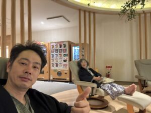 蓼科グランドホテル滝の湯には全部で4種類のお風呂があります(渓流露天風呂と庭園大浴場が男女入れ替えで計4通り)。連泊しても飽きることなく楽しめます。2日目の湯上がりラウンジでは、二人でのびのびとくつろぎました。