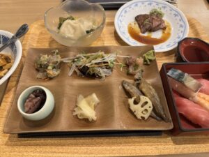 夕食は和食・洋食・スイーツ約70種以上のビュッフェ。全長約15mのライブキッチンカウンターで料理人が目の前で調理する出来立て料理は迫力があり、シンボルの石窯ピザも美味しかったです。母と二人して、歩いた分以上にしっかりカロリーを吸収してしまいました(笑)。