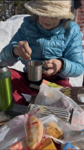 下山途中、北横岳ヒュッテ前のベンチでお昼休憩にしました。母がテルモスからコーヒーを注いでくれました。砂糖を持参していたのですが、マドラーを忘れていた……かと思ったら、母がポッキーを取り出してコーヒーをくるくるかき混ぜ始めました。「さすが登山歴56年のベテランの知恵だな」と笑いながら感心しました。山での知恵とユーモアはセットです。