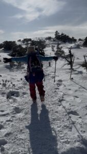 実は後から気づいたことですが、私たちが到達したのは北横岳南峰(2,471m)まででした。北峰(2,480m)もすぐそこにあったのですが、あまりの強風と寒さで先の道まで確認する余裕がなく、南峰で十分満足していたので下山を決断しました。南峰からは縞枯山や南八ヶ岳の展望が、北峰からは蓼科山が大きく見えるそうです。次回はぜひ北峰まで行きたいと思います。