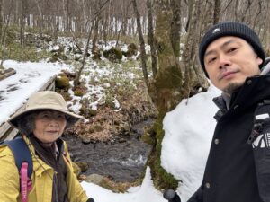 途中の休憩タイムに母がテルモスからほうじ茶を注いでくれました。前日の山頂での熱湯と同じように、テルモスに入れたほうじ茶が雪の中でじんわり体を温めてくれる。何気ない一杯が、こんなに美味しいと感じる瞬間が登山や山歩きの醍醐味だと思います。