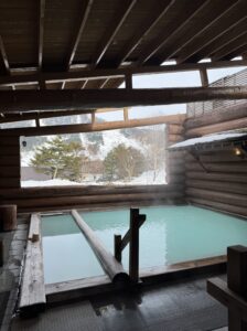 温泉は1,000年以上の歴史があると言われる鹿沢温泉を引き湯した本格的な名湯です。大浴場に四季折々の自然の景色を眺める露天風呂を併設しており、雪見露天風呂を楽しめる冬は特に贅沢です。雪道をアイゼンで歩いた足に、温泉の温もりがじんわり染み渡ります。