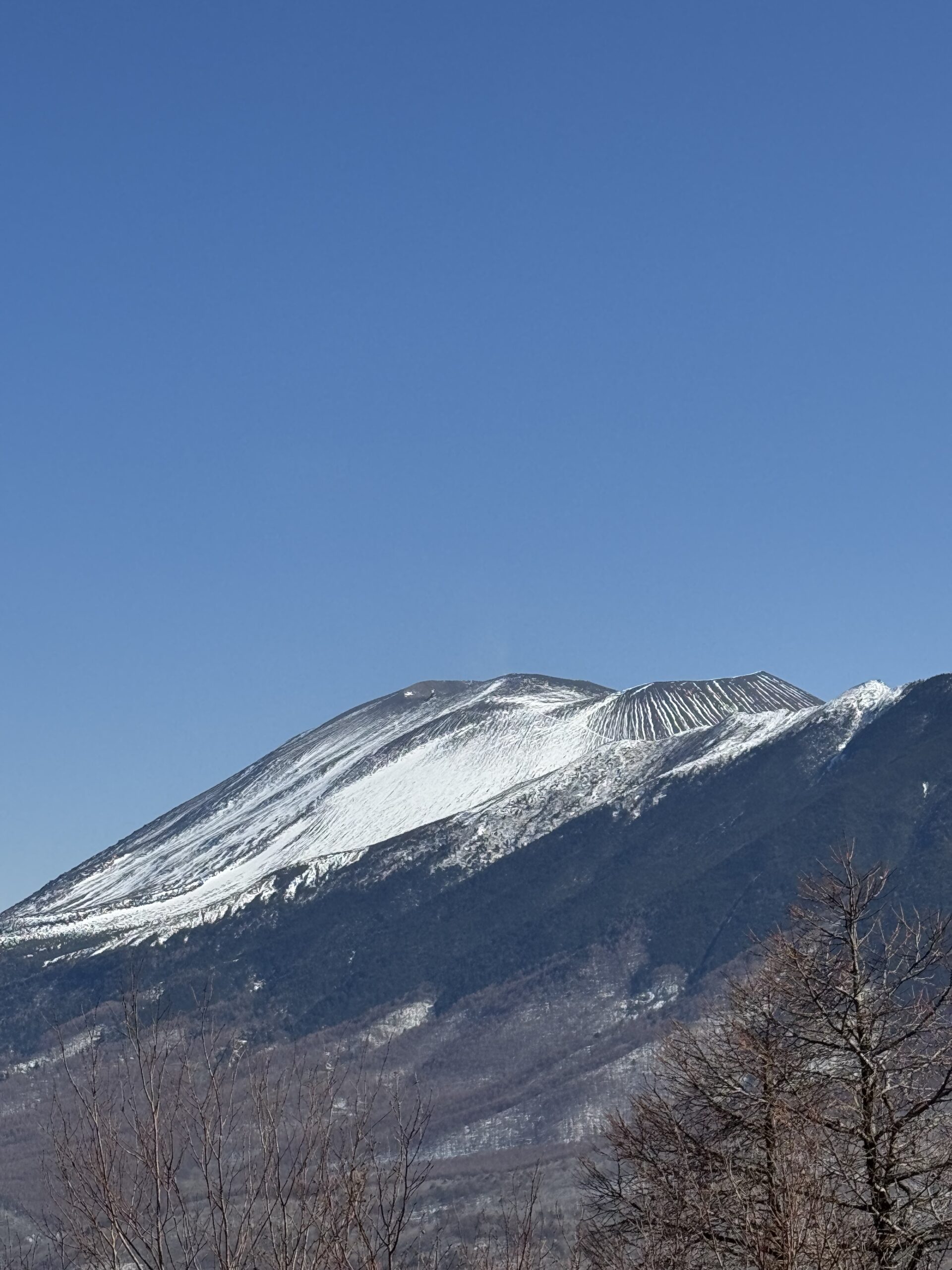 正面にどっしりと構える浅間山(2,568m)。3月の浅間山は山頂部がうっすら溶けかけた雪と黒い岩肌が混ざり合い、まるで溶けかけたガトーショコラのような独特の表情を見せていました。そして頂上からはうっすらと噴煙が立ち上っています。活火山の証です。日本百名山であり現在も活動を続ける浅間山を、これほど間近に、そして静かに独占して眺められる場所はそうありません。