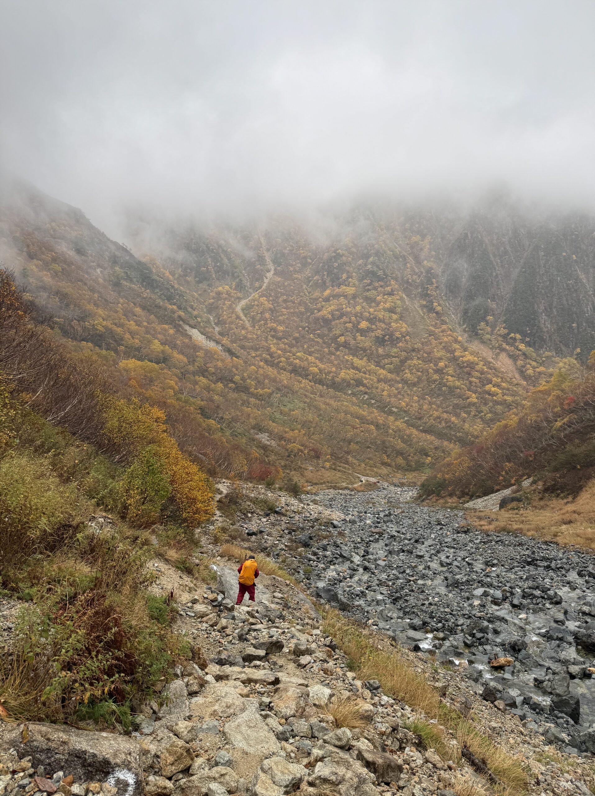 昨日の抜けるような青空の下の紅葉とは、まるで別物だ。低い雲が垂れ込め、視界は遮られている。 しかし、その雲の下に広がる紅葉は、雨に濡れることでより一層鮮やかな色彩を放っていた。静謐で、どこか神秘的ですらある。晴天だけが山の正解ではない。雨の日には雨の日の、奥行きのある美しさが存在することを再確認させられた。