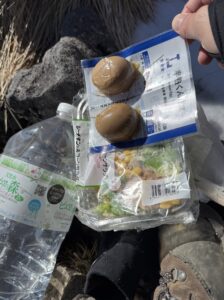 暑がりの母も流石に山頂では寒く、腰に巻いていたアウターを着込みました。昼食は前日コンビニで買ったパン。「寒いのにサラダ?」と思ったら母がザックからサラダと燻製卵を取り出してニコニコ差し出してくる。笑えるシーンでした。