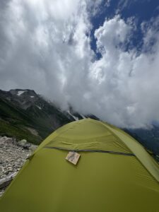 私も後を追うが、テント装備の重いザックが崖底へ引っ張る力を感じ、初めて登山で怖いと思わせられた。