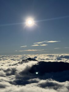 少し登ると、猛烈な強風にさらされた。暑がりの母も迷わずレインウェアを着込む。 振り返れば、圧倒的な大雲海。今日の雨予報は、どうやら私たちのずっと下、雲の底の話らしい。