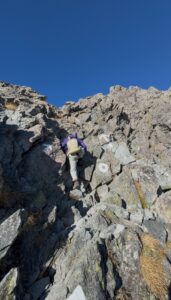 足場が見つかりにくい難所だった。 その短い一言に、長年山を歩き続けてきた人だけが持つ、経験の重みと深い愛情を感じた。 下山こそが登山の本番。母の背中には、一切の油断もなかった。