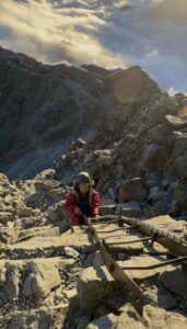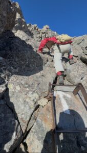 岩場、鎖場、そして垂直に切り立つ鉄梯子。 小柄な母の一歩では、見ているこちらが肝を冷やす場面もある。 それでも母は、一歩一歩、自分の力で岩を掴み、頂へと近づいていった。
