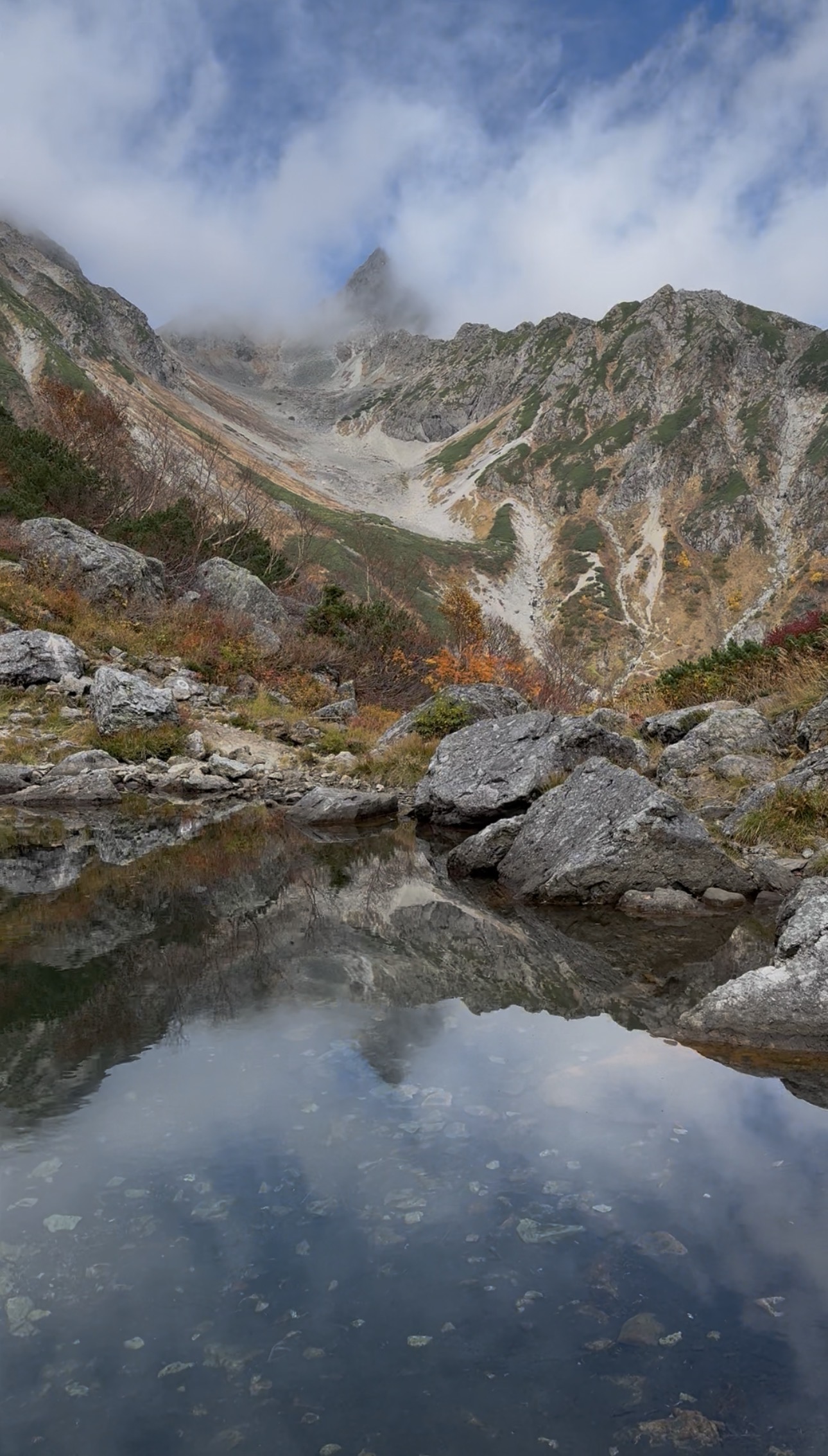 指を差した先の雲が、生き物のように割れました。 「あ……!」 現れたのは、鋭く天を突く槍ヶ岳。 「おー!!」 その場にいた全員から、自然と歓声が上がりました。風が止み、池にはくっきりと「逆さ槍」。 母の「来れて嬉しい」という呟きが、静かな池に溶けていきました。